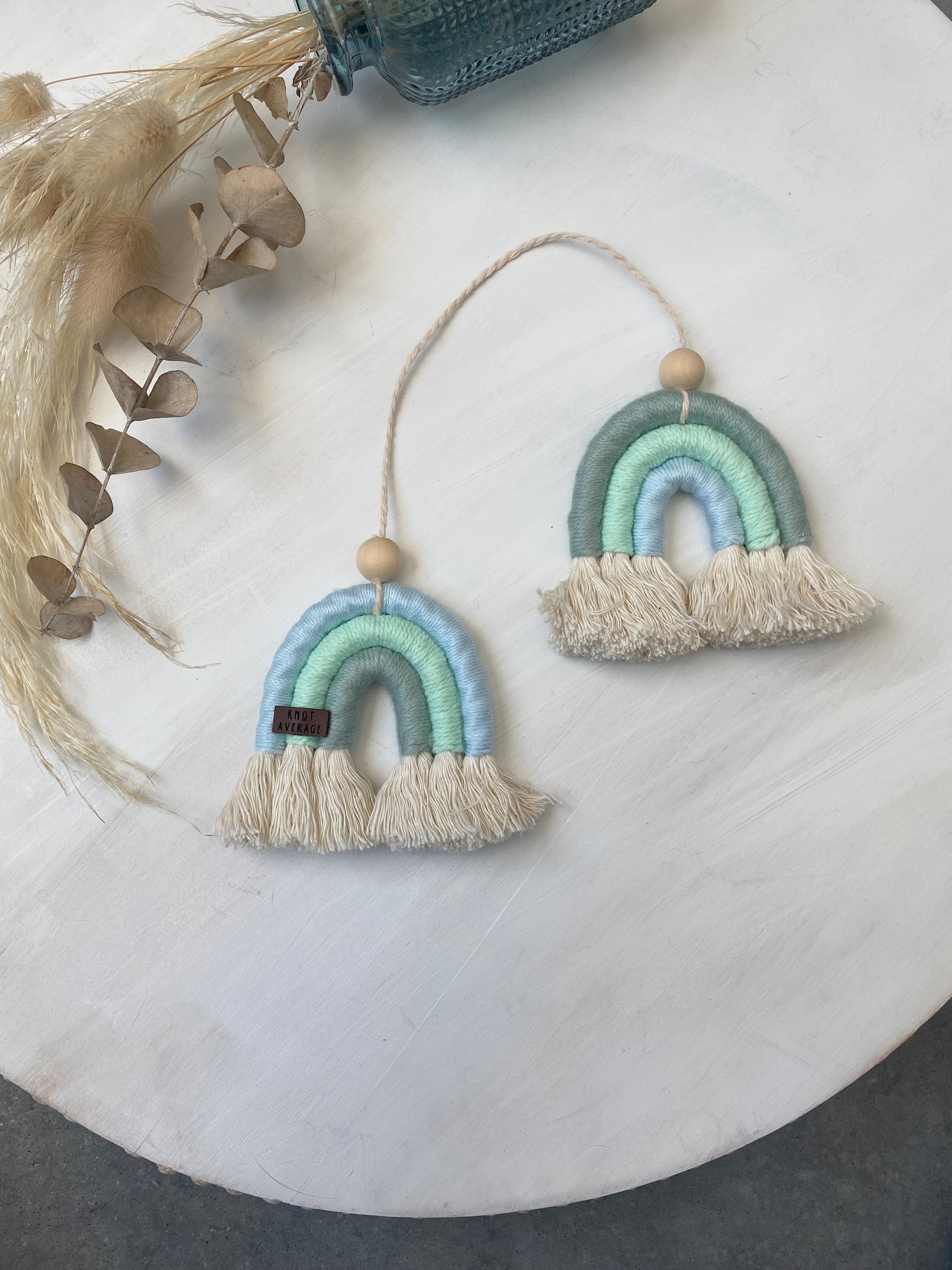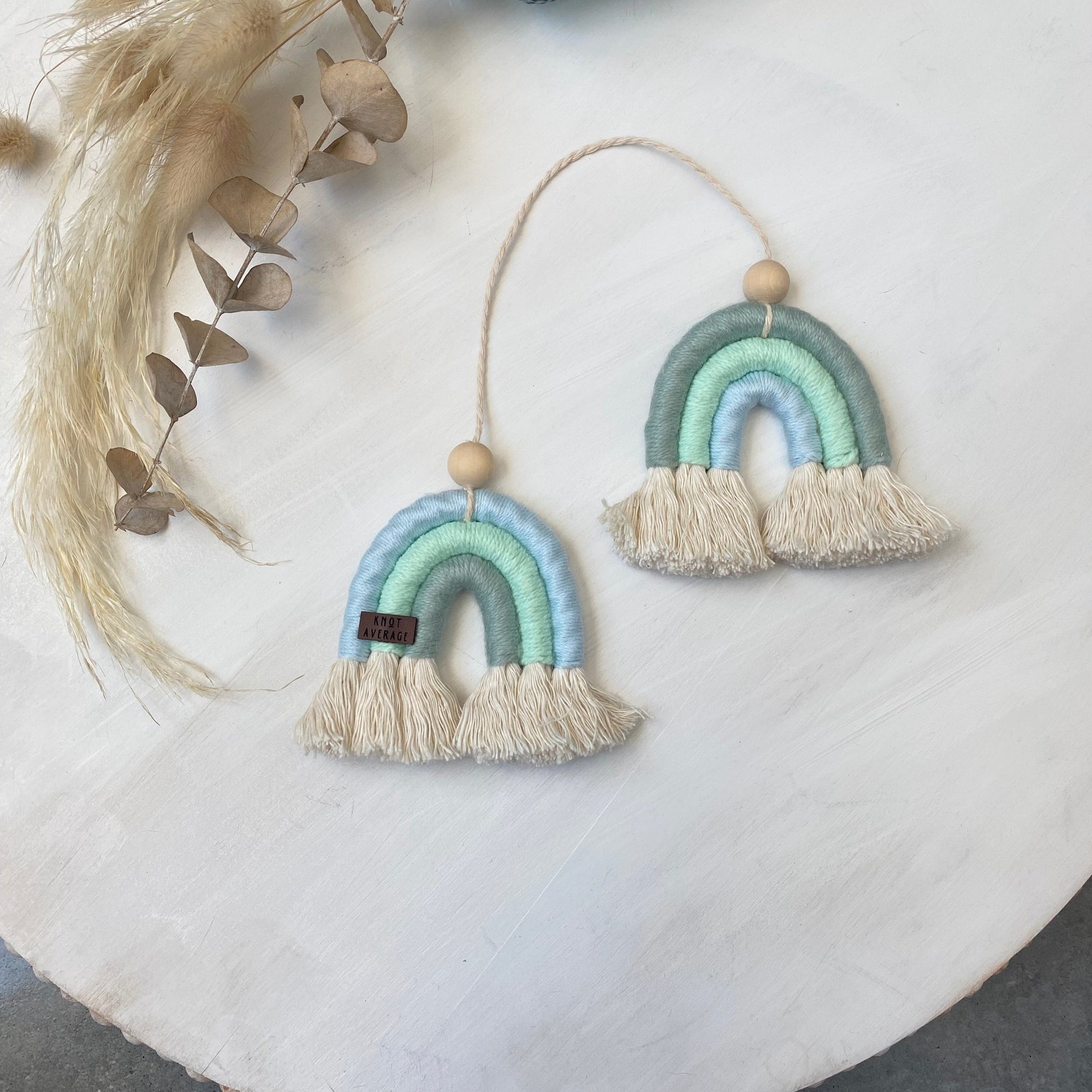 These mini rainbows measure 2.5" across and about 3" from wooden bead to bottom of fringe.
