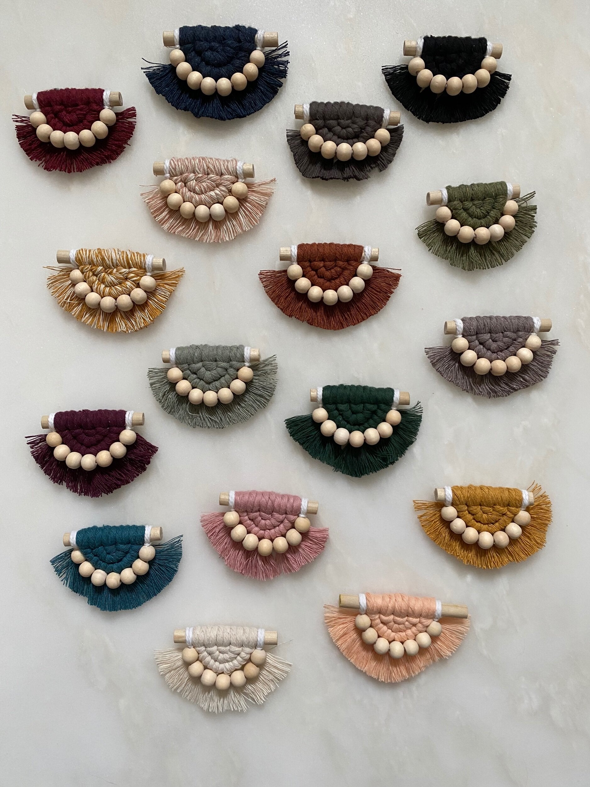 These are made with 100% cotton cord, natural wooden beads, and metal and plastic vent clip attached to the back.