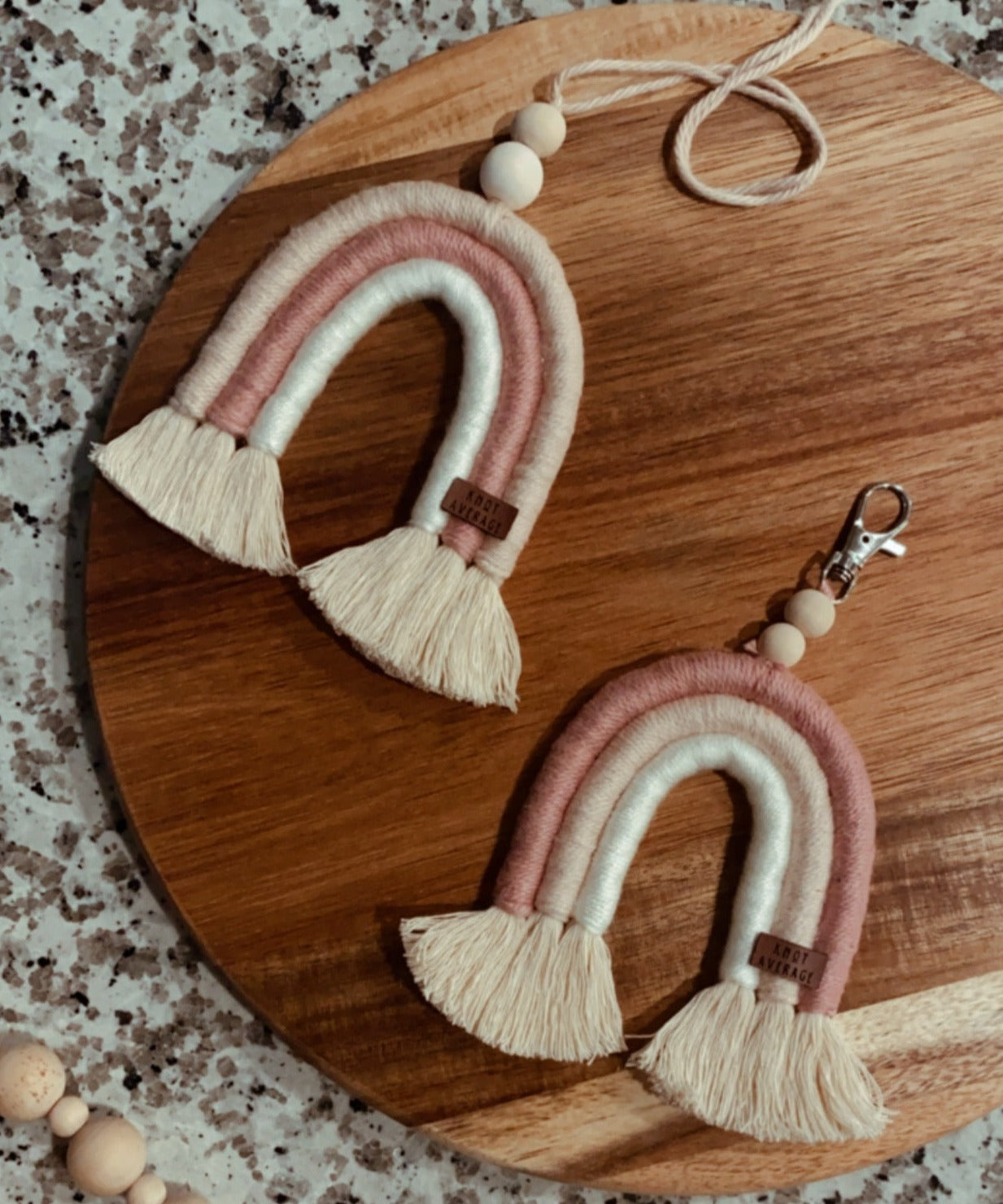 Each keychain charm is handmade by me and made from 100% organic vegan cotton rope, 100% cotton yarn, and untreated wooden beads.
