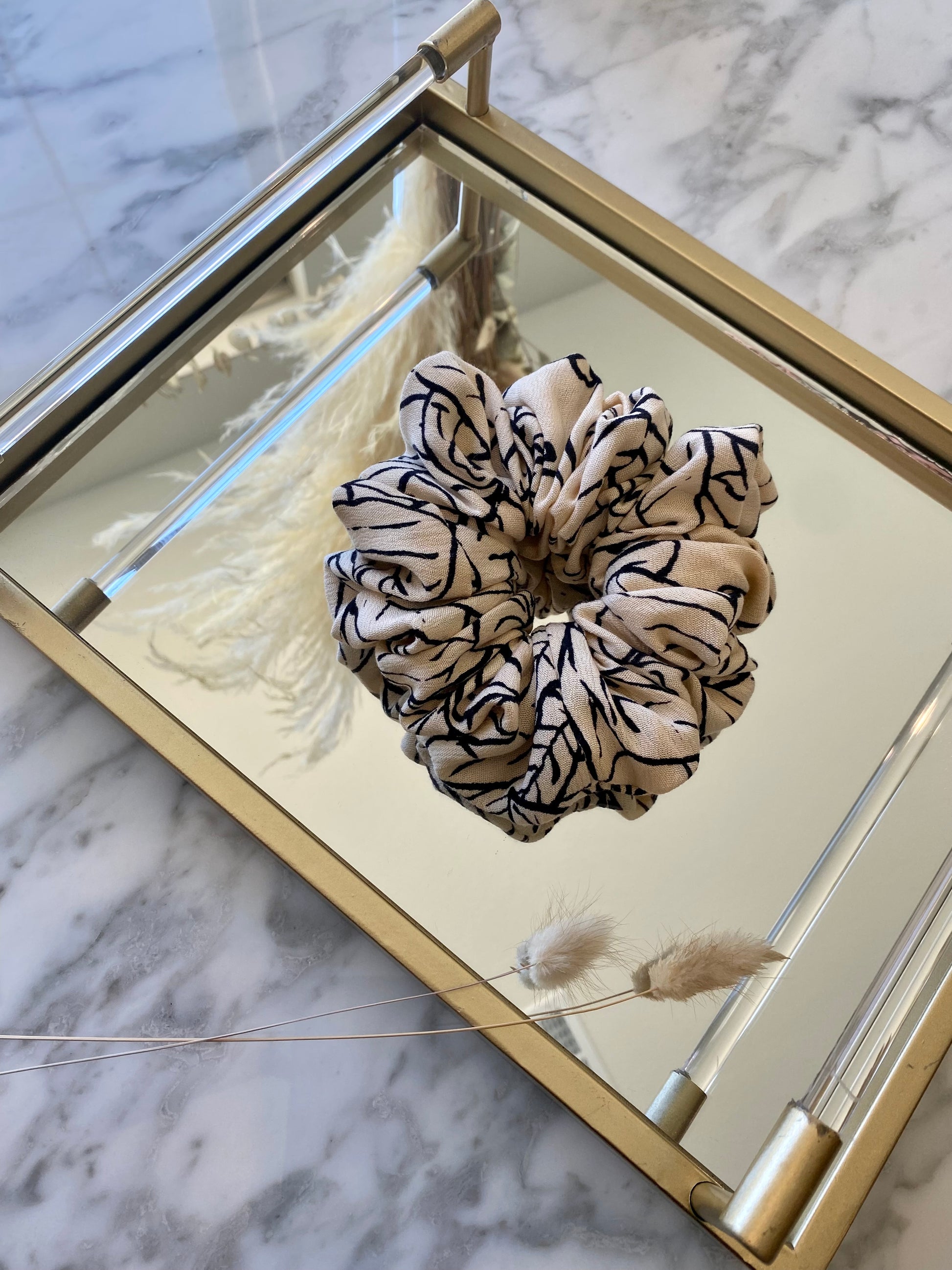 Light weight taupe chiffon fabric with black line drawn floral print XL scrunchie
