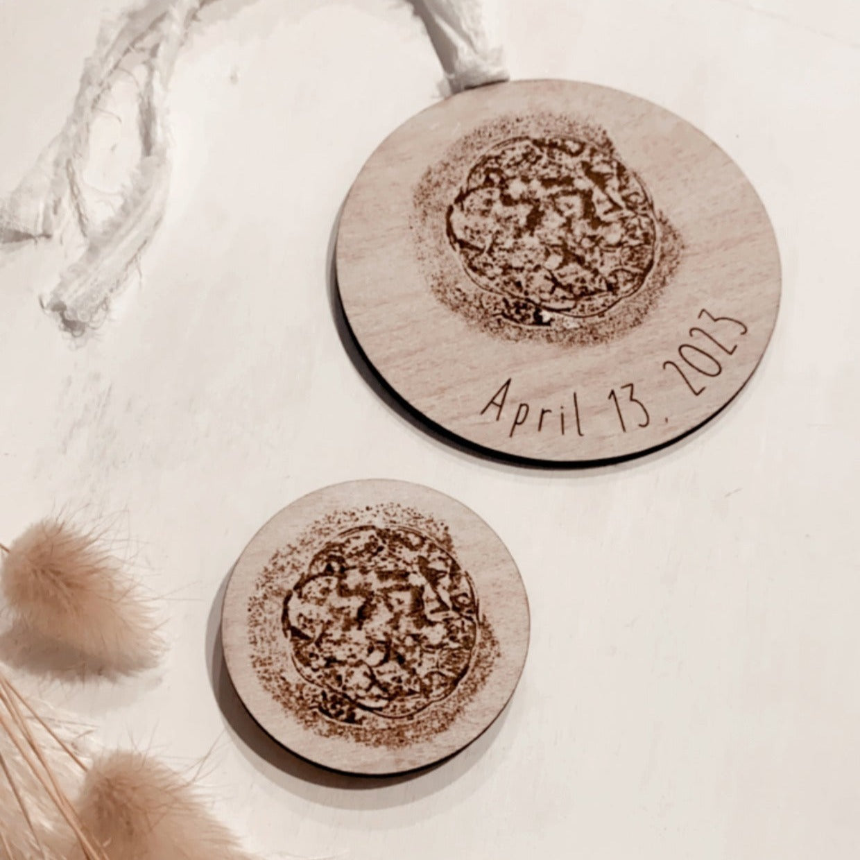Each ornament is meticulously designed from your embryo photo given to you on your transfer day. It is then laser engraved into white washed 1/4" birch wood. The back side is stained dark espresso brown to professionally finish off your new ornament.