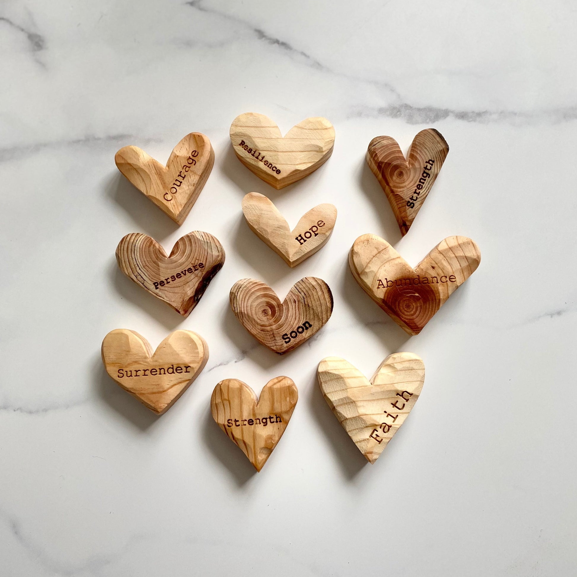 Each wooden heart is meticulously hand cut, hand shaped and finished and then customized with your chosen word of the year - resulting in a one-of-a-kind piece that embodies craftsmanship and personal inspiration.