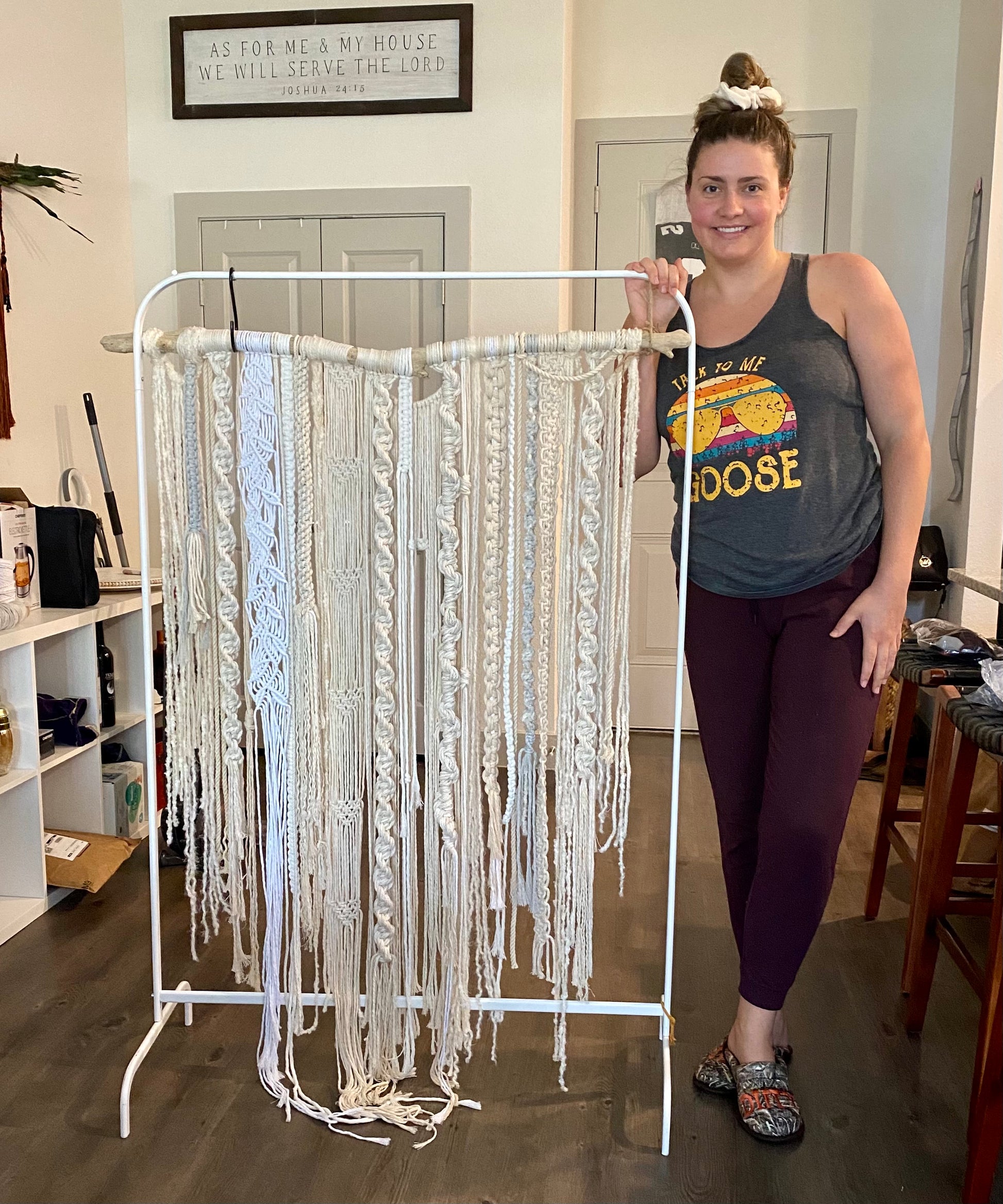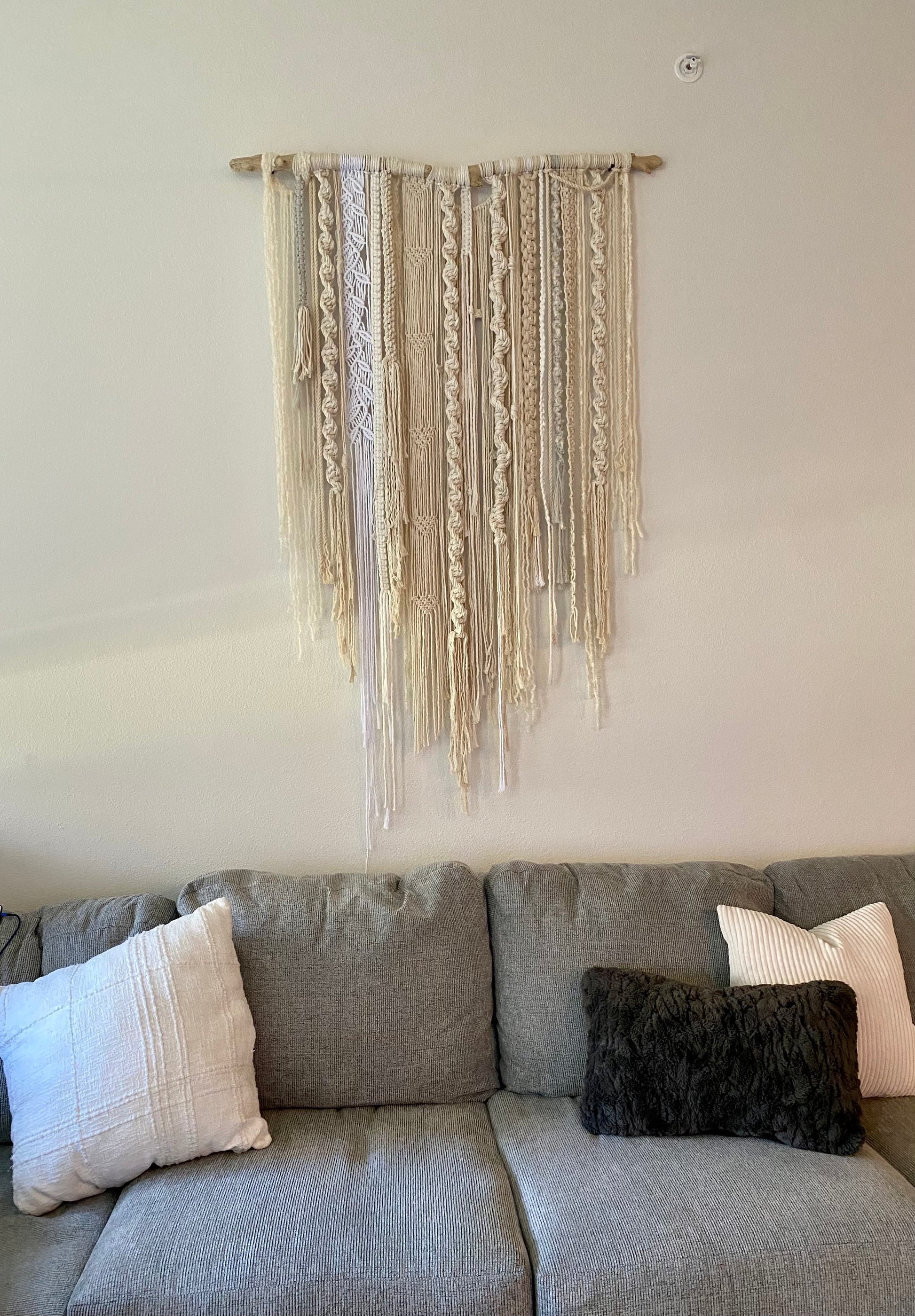 This beautiful wall hanging measures approximately 4' horizontally and 6' vertically. The texture forward design adds so much dimension while the simple variation of cream cords adds beauty to any space.